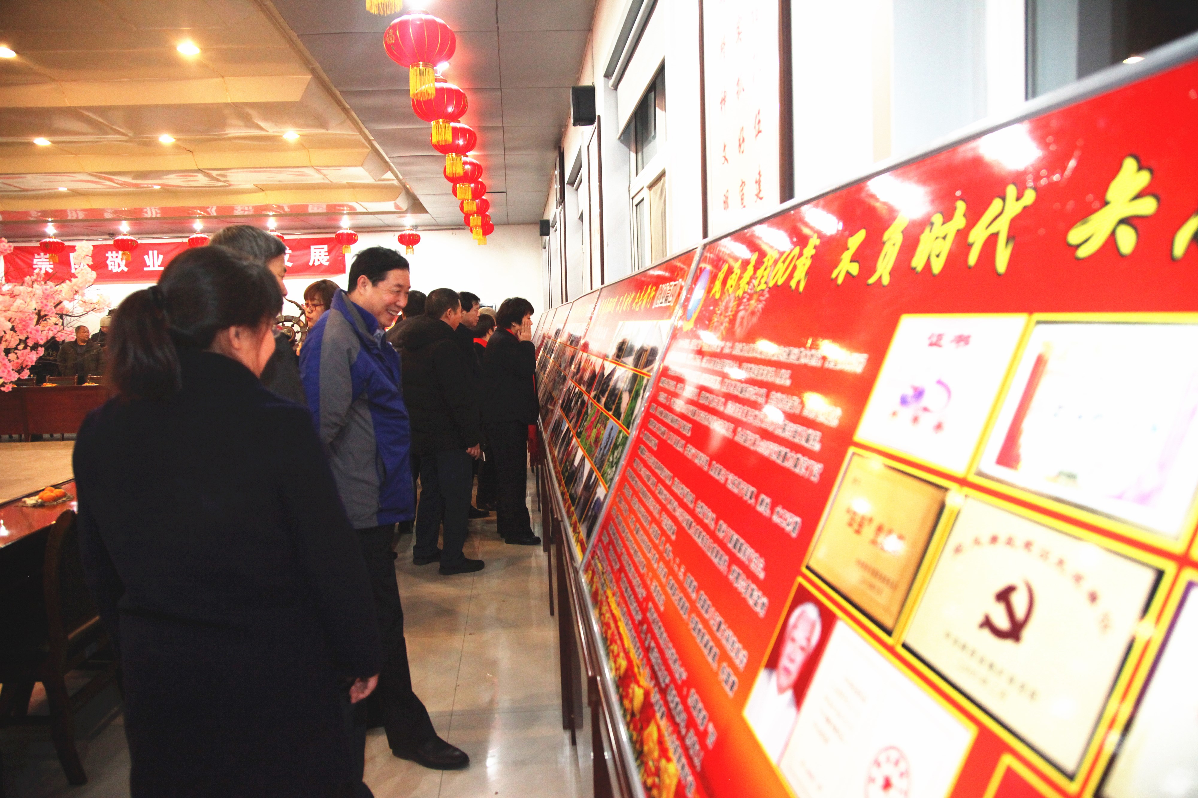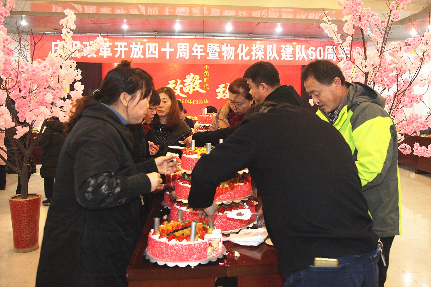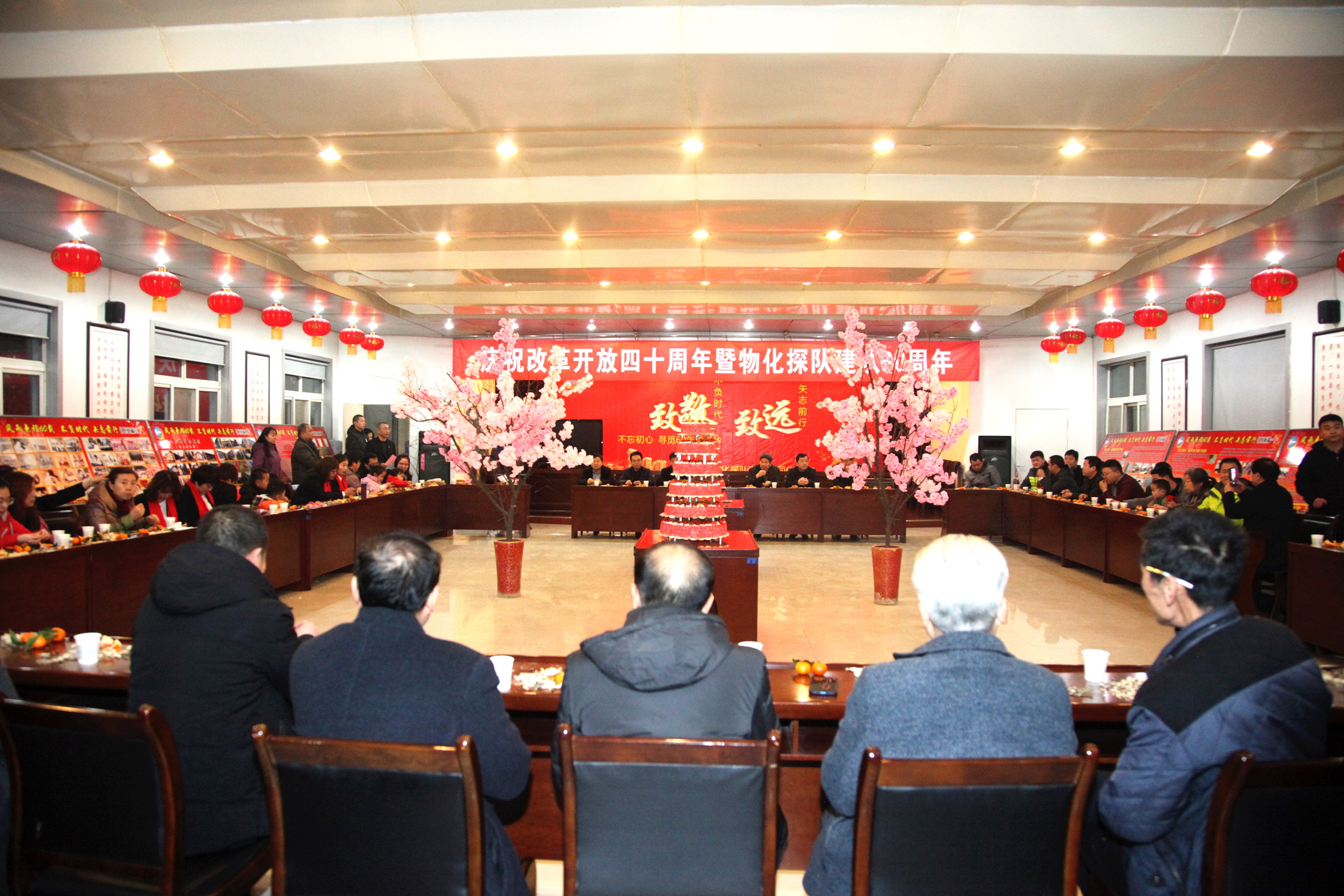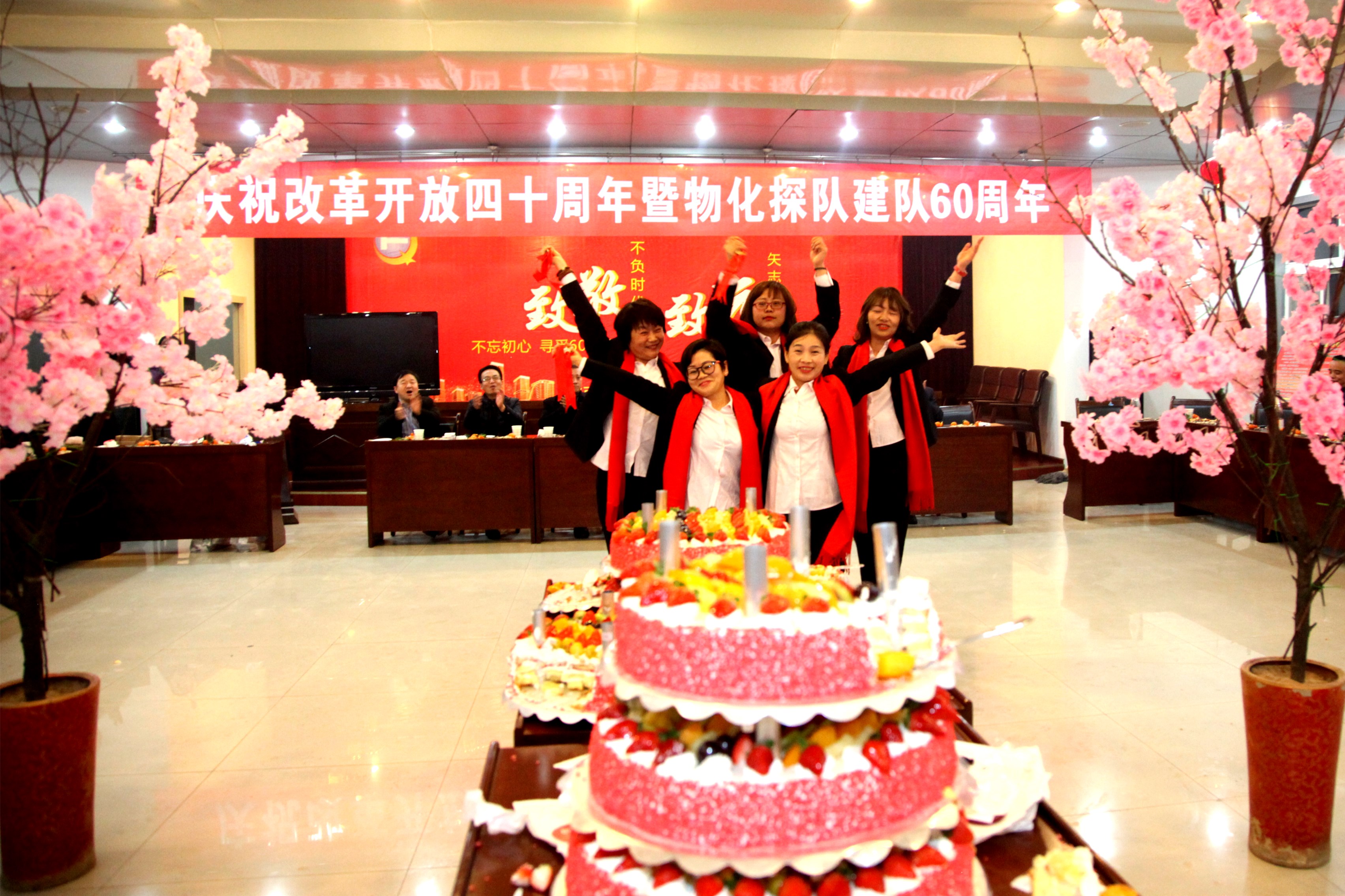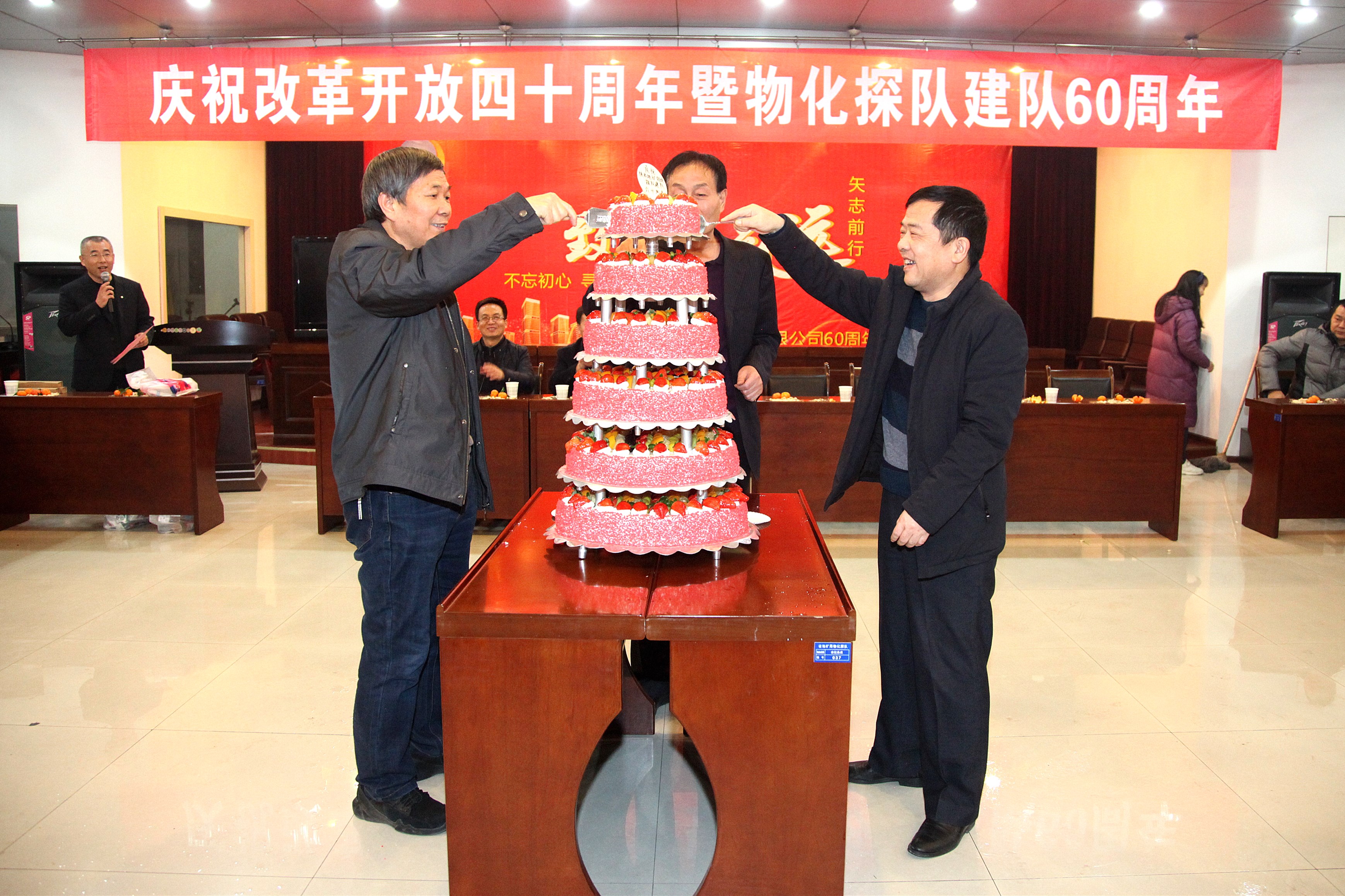? ? 活動中,三位副咨詢員共同切開了象征美好向上的蛋糕;用香檳開啟了美好的祝福。職工們吃著甜美的蛋糕、喝著幸福的香檳酒、共敘60年發展歷程、參觀展出、快板《物化探隊贊》、物化探隊歷史大事件的競答、一首首紅歌演唱、歡快的舞蹈等,在冬日里串起濃濃的喜悅之情。在全體職工齊唱的《東方紅》歌曲聲中慶祝活動圓滿落下帷幕。