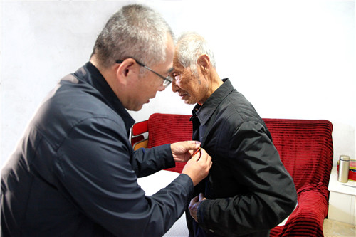 ? ? 許俊賢同志祖籍陜西涇陽,抗美援朝后轉(zhuǎn)業(yè)到地方工作,1975年調(diào)到物化探隊工作。23日上午,李新勝來到老戰(zhàn)士許俊賢家中,鄭重地為年近九旬的老人佩戴紀念章,并親切交談,關切詢問他的生活起居、健康狀況等情況,代表物化探隊黨委向許俊賢老人表示親切慰問,對許俊賢老戰(zhàn)士為保衛(wèi)祖國、捍衛(wèi)和平作出的奉獻與犧牲致以崇高敬意。