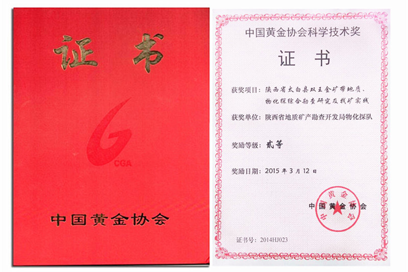 ? ? 物化探隊承擔(dān)的2014年完成的“陜西省太白縣雙王金礦帶地質(zhì)、物化探綜合勘查研究及找礦實(shí)踐”項目,榮獲中國黃金協(xié)會頒發(fā)的“科學(xué)技術(shù)二等獎”。同時獲此殊榮的個人有項目負(fù)責(zé)毛軍衛(wèi)、技術(shù)負(fù)責(zé)馮旭輝、技術(shù)員劉昊培。