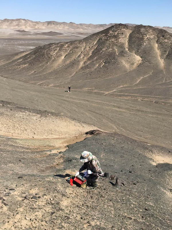 ??? 該項目工作區位于吐魯番-哈密盆地南緣低山丘陵戈壁荒漠區,干旱貧水區,幾乎無植被覆蓋,七月最熱,最高可達45℃以上,地表溫度六七十度左右,工區無水無電,生產生活用水都是從工區外100多公里拉進去,用電全靠發電機。面對惡劣環境,項目組積極采取措施保障后勤供給,在合理安排野外高溫作息時間,配備防曬防暑用品,在項目黨小組的帶領下,項目組成員團結一心,攻堅克難,早晨摸黑起床,到達工區天微微亮便開始工作,以避開中午高溫時段露天作業。目前項目實施進展順利,預計8月底完成該項目的野外勘查工作。